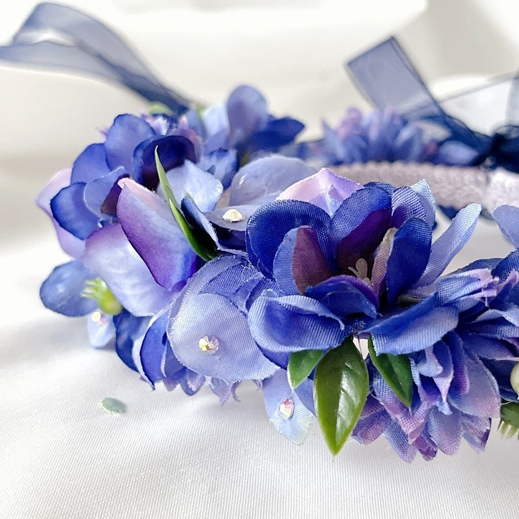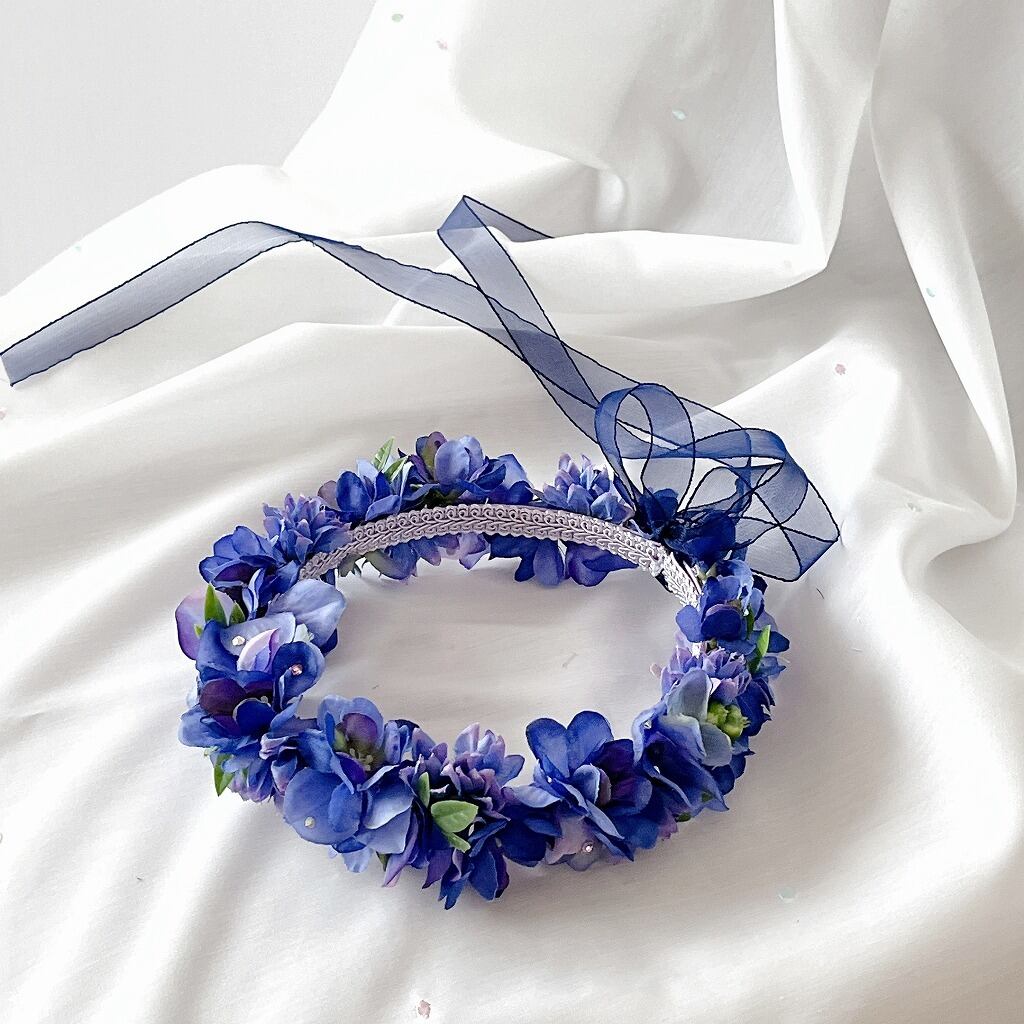 ラインストーンが光る ネイビーブルー花冠 花かんむり カチューシャ ヘアアクセサリー キッズ 子供用 女の子 ヘッドドレス フラワーガール リングガール モチーフ 髪飾り H-74